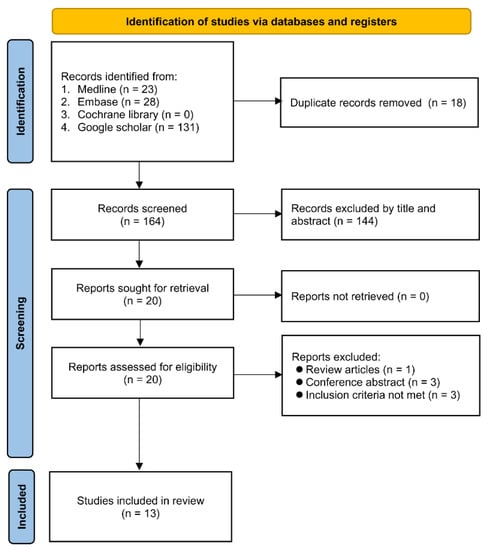 The flow diagram depicting the process of the study selection is shown in Figure 1. Of a total of 182 records retrieved on the initial database search, 164 were preserved after excluding 18 duplicates. Following the further exclusion of 144 records during screening of their titles and abstracts, six more articles were excluded after full-text assessment because of being a review article (n = 1), abstract (n = 3), lack of available outcomes (n = 2), or focusing on disease progression instead of severity or mortality (n = 1) [27]. Finally, 13 studies involving 4204 patients published between 2020–2021 were eligible for quantitative syntheses [11,19,20,21,28,29,30,31,32,33,34,35,36].