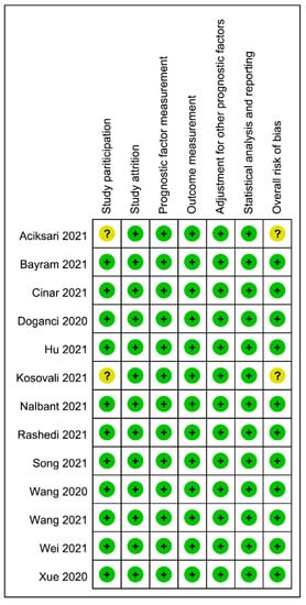 Risks of bias assessed according to the Quality in Prognostic Studies (QUIPS) tool [11,19,20,21,28,29,30,31,32,33,34,35,36].