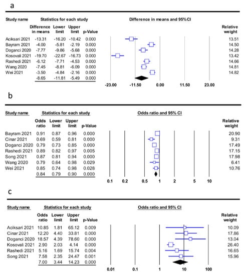 First, based on the PNI in the mortality and non-mortality groups in seven studies [19,21,28,29,32,34,36], the merged results revealed a lower mean PNI among patients in the mortality group (MD: −8.65, 95% CI: −11.81 to −5.49, p < 0.001, I2 = 95.3%) compared to that in the non-mortality group (Figure 3a). Second, when PNI was used as a continuous measure to predict the risk of mortality in seven studies [11,19,20,21,29,34,36], the pooled results demonstrated that a higher PNI was related to a lower risk of mortality (OR: 0.84, 95% CI: 0.79 to 0.9, p < 0.001, I2 = 67.3%) (Figure 3b) with the demonstration of a correlation between an additional increase in one unit in PNI and an 16% decrease in the odds of mortality. Third, an analysis of the link between PNI as a binary variable (i.e., high vs. low) and the risk of mortality in six studies [11,20,28,29,32,36] also revealed an association of a lower PNI with a higher mortality risk (OR: 7, 95% CI: 3.44 to 14.23, p < 0.001, I2 = 65.7%) (Figure 3c). A sensitivity analysis supported the consistency of the results from the three approaches.