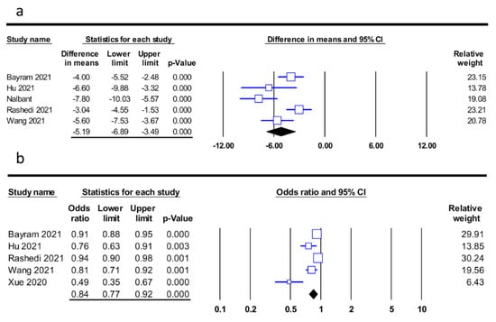 The merged results from five studies with information on PNI in the severity and non-severity groups [19,21,33,35,36] demonstrated a lower mean PNI among patients in the severity group (MD: −5.19, 95% CI: −6.89 to −3.49, p < 0.001, I2 = 73.4%) compared to that in the non-severity group (Figure 4a). Using another approach, in which PNI served as a continuous measure to predict disease severity, the pooled results from five studies [19,30,31,35,36] also demonstrated a negative correlation between PNI and disease severity (OR: 0.84, 95% CI: 0.77 to 0.92, p < 0.001, I2 = 83%) (Figure 4b). The sensitivity analysis demonstrated the robustness of the results from the two approaches.