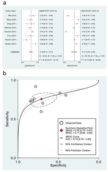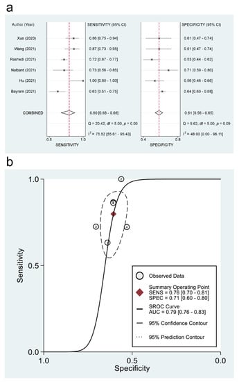 The pooled sensitivity and specificity of using PNI for the prediction of mortality were 0.76 (95% CI = 0.7–0.81; I2 = 84.9%) and 0.71 (95% CI = 0.6–0.8; I2 = 97.22%), respectively (Figure 5a). The linear regression for sROC generated after mathematical manipulation of true and false positivity (1-specificity) of each study revealed an AUC of 0.79 (95% CI = 0.76–0.83) (Figure 5b). Deeks’ Funnel Plot Asymmetry test showed no significant publication bias (p = 0.07). Regarding the use of PNI for the prediction of disease severity, pooled sensitivity and specificity were 0.8 (95% CI = 0.68–0.88; I2 = 75.52%) and 0.61 (95% CI = 0.56–0.65; I2 = 48%), respectively (Figure 6a). The linear regression for sROC demonstrated an AUC of 0.65 (95% CI = 0.61–0.69) (Figure 6b). Deeks’ Funnel Plot Asymmetry test indicated significant publication bias (p = 0.01).