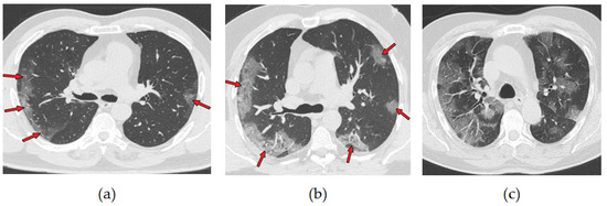 A chest CT scan combines data from multiple X-rays taken from different angles, which produces a detailed image of the lungs. CT scans are more effective than chest X-ray in early stages of COVID-19 disease detection. They have been used as a tool to diagnose and monitor the progression of the disease [9]. More than 70% of chest CT scans in patients with RT-PCR test-proven COVID-19 cases report ground-glass opacities, vascular enlargement, bilateral abnormalities, lower lobe involvement, and posterior predilection [10]. Figure 2 illustrates those abnormalities. Studies by [11,12] confirm that patients with COVID-19 pneumonia have ground-glass opacities in the earlier stages of the disease and pulmonary consolidation in later stages. Eventually, a rounded morphology and a peripheral pulmonary distribution are observed. Those abnormalities are analogous to those observed in other coronavirus infections, such as SARS-CoV-1 and MERS-CoV [13].
