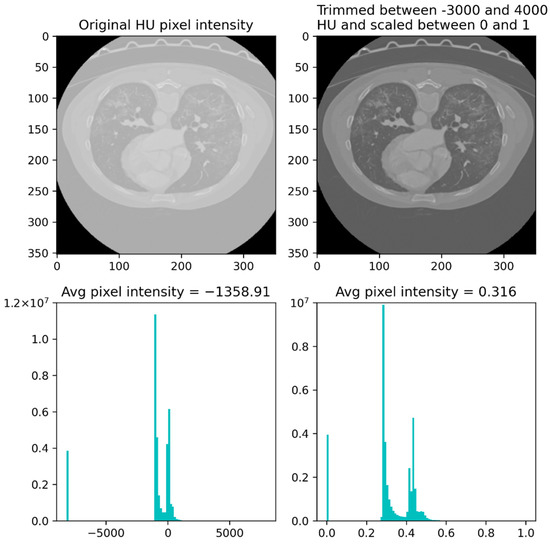Before executing the described slice-wise selection, the CT scans were trimmed between –3000 and 4000 Housefield units (HU) and scaled between 0 and 1. We reshaped the 16 slices chosen from each CT scan to a 512 × 512 × 16 × 1 format. Figure 3 depicts a single slice from an exam both before and after being pre-processed.