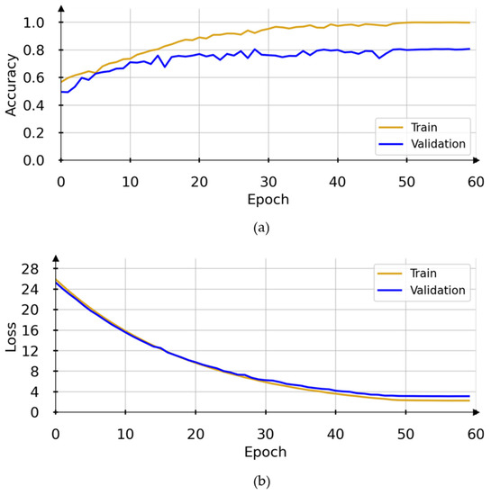 Model performance achieved during the development. In (a), training and validation accuracy. In (b), training and validation loss.