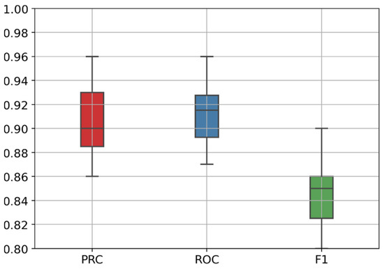 Figure 6 presents the boxplot of the stratified 10-fold cross-validation results, and Table 5 presents the evaluation results for each validation fold in more detail. We can observe that the PR-AUC varies from 0.86 to 0.96, the ROC-AUC varies from 0.87 to 0.96, and the F1-score varies from 0.80 to 0.90. Those results represent a good overall performance when compared to several recent related works [21,46,47].