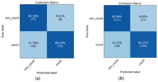 Confusion matrix results for model evaluation on the test datasets, (a) test dataset 1, and (b) test dataset 2.