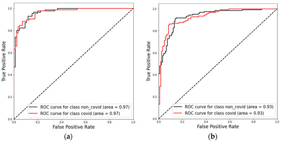 ROC curves obtained for model evaluation on the test dataset 1 (a) and on the test dataset 2 (b).