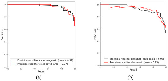 Precision-recall curves for model evaluation on both test datasets. (a) Results for test dataset 1 and (b) results for test dataset 2.