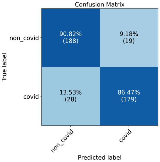 There are more pooling layers in the two initial convolutional blocks than in the final ones. We chose this approach to reduce the tensors size and fit them in the available GPU memory. We also added batch normalization layers after every convolutional layer and a single dropout layer with a 0.5 dropout rate to enhance the training performance and prevent overfitting. The final feature map runs through two FC layers, the first with 4096 neurons and the second being the output layer with a sigmoid activation function to generate a binary output, namely COVID-19 or non-COVID-19. All hidden layers are built with the rectified linear unit (ReLU) [43] activation function. The model had 47.3 million parameters, was trained in a computing node with four NVIDIA GPUs V100 32 GB SXM2, and took 9313 s to train 56 epochs.