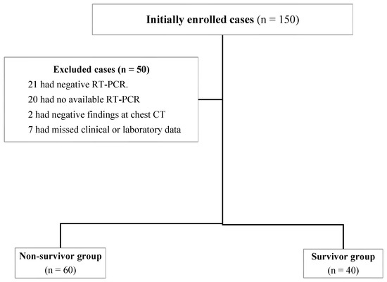 One hundred and fifty consecutive patients fulfilled the inclusion criteria and were initially enrolled in this study. Of them, 109 patients were confirmed by a real-time reverse transcription polymerase chain reaction (RT-PCR) throat swab [22]. Then, 9 patients were excluded: 2 patients with negative findings at chest CT and 7 patients with incomplete clinical or laboratory data. Finally,100 patients were included in the study. A flow chart illustrating participant selection in the study is demonstrated in Figure 1.