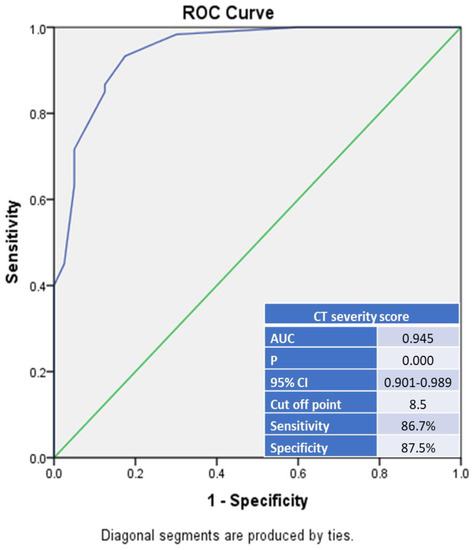 In patients with COVID-19, qualitative and quantitative chest CT parameters are predictors of mortality [43]. In our study, TSS revealed excellent diagnostic accuracy using a cut-off value of 8.5 or above for the detection of in-hospital mortality in COVID-19 patients with ARI/CKD, with 86.7% sensitivity and 87.5% specificity. Similar results were found in a retrospective single study from China conducted on 78 COVID-19 patients investigating the relationship between COVID-19 imaging findings and clinical categorization. The researchers found that a TSS threshold of 7.5 showed a sensitivity of 82.6% and a specificity of 100% for diagnosing severe–critical COVID-19 infection [24]. Another study revealed concordant results, with 77.3% sensitivity and 90.5% specificity using a relatively higher TSS cutoff value of 12 to differentiate severe critical cases from non-severe cases [21].The combination of both qualitative and quantitative assessment could help to distinguish severe critical cases from non-severe cases, and could aid in the rapid diagnosis of and care for critical cases, thereby decreasing mortality and improving patient outcomes.