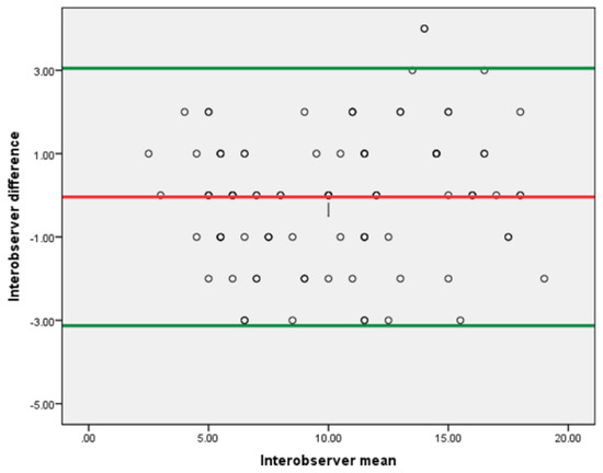 Two-hundred observations were described in order to calculate the TSS. The interclass correlation (ICC) for TSS between the two observers was 0.956. The Bland–Altman plot (Figure 5) revealed excellent interobserver agreement between the two independent observers in quantitative lung assessment using the TSS.