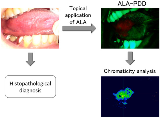 Photodynamic diagnosis (PDD) using 5-aminolevulinic acid (ALA; ALA-PDD) enables the visualization of malignant lesions as red fluorescence [18,19,20]. ALA is an endogenous natural amino acid synthesized from glycine and succinyl coenzyme A in the mitochondria and is finally converted to heme through the biosynthetic heme pathway. After ALA administration, exogenous ALA is incorporated into the cell and converted to the fluorescent molecule protoporphyrin IX (PpIX) downstream of the biosynthetic pathway [21]. In normal cells, excess PpIX is quickly metabolized or released from the cells through regulation by negative feedback; however, PpIX accumulates at high levels in cancer cells [18,22,23]. Briefly, cancer cells with an accumulation of PpIX emit red fluorescence (635 nm) when irradiated with visible blue light (405 nm) [18]. Thus, ALA-PDD can be used to visualize cancers as red fluorescence. For the first time in the field of oral and maxillofacial surgery, Leunig et al. applied ALA-PDD to oral mucosa lesions and indicated that ALA-PDD had high sensitivity and low specificity for detecting oral cancer and severe to moderate dysplasia (90% and 60%, respectively) [24,25,26]. One cause of the low specificity might be the subjective judgment of whether the lesions emit red fluorescence; indeed, it is especially difficult to judge oral lesions with weak red fluorescence and depends greatly on the examiner’s experience and skills. Thus, some reports have attempted to qualify the fluorescence excited from the oral lesions [27,28,29,30] to improve specificity.