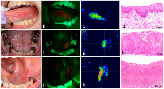 Case 1 was a 30-year-old Japanese woman with a slight erosion on the left side of the tongue, without induration (Figure 3a). ALA-PDD detected the lesion as red fluorescence, ultimately diagnosed as severe OED (Figure 3b,d). In the chromaticity image, the red fluorescence could be extracted as blue to green-red depending on the degree of redness, whereas the normal area was dark blue (Figure 3c). Case 2 was a 68-year-old Japanese man with a wide, white lesion on the oral floor (Figure 3e). The device detected red fluorescence emitted from the left side of the lesion (Figure 3f,g). This fluorescent area was diagnosed histopathologically as early invasive OSCC (Figure 3h), whereas another area with a white lesion was mild OED. If ALA-PDD had not been applied to this case, an optical biopsy site, the highly malignant area would not have been selected, leading to misdiagnosis. Case 3 was a 73-year-old Japanese woman with a white-and-red lesion on the left side of the mandible gingiva (Figure 3i). ALA-PDD detected red fluorescence emitted from the lingual side of the lesion (Figure 3j,k), and the final histopathological diagnosis was well-differentiated early OSCC (Figure 3l).