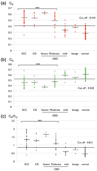 Scatter plots of the CR and CG and CR to CG ratio for different stages of oral lesions. (a) CR: chromaticity x (red). The cutoff value (0.410) indicates the borderline between OSCC, CIS, severe or moderate OED, and mild OED or benign lesions. (b) CG: chromaticity y (green). The cutoff value (0.520) differentiates between OSCC, CIS, severe and moderate OED, and mild OED and benign lesions. (c) CR/CG; CR to CG ratio (gray). The cutoff value (0.813) separates OSCC, CIS, and severe and moderate OED from mild OED and benign lesions (*** p < 0.001; comparison between OSCC, CIS, severe and moderate OED, and mild OED and benign lesions).