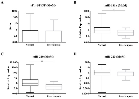 Box plots of the multiple of median (MoM) values of first trimester (A) sFlt-1/PlGF; (B) miR-181a; (C) miR-210 and (D) miR-223. Comparisons between normal (n = 139) and PE (n = 13) group were calculated by Mann–Whitney U test, * p < 0.05, ** p < 0.01.