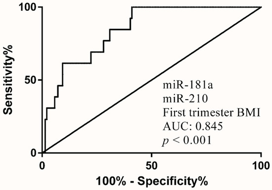 Our study demonstrated that specific factors express significantly in the first and third trimesters in the Asian population. A significant difference in BMI between the PE and the normal group was observed in the first and third trimesters. Consequently, BMI served as an essential factor in the prediction model. Correlation among obesity, miR-181a, and miR-210 was reported in previous studies. Adipose tissue would express lower miR-181a but higher miR-210 in the placenta of pregnant women with high BMI [27,28,29]. In this study, we revealed a strong positive correlation between miR-181a and miR-210 in both the first and third trimesters (Figure S1), suggesting that these factors might be involved in the pathophysiology of PE.