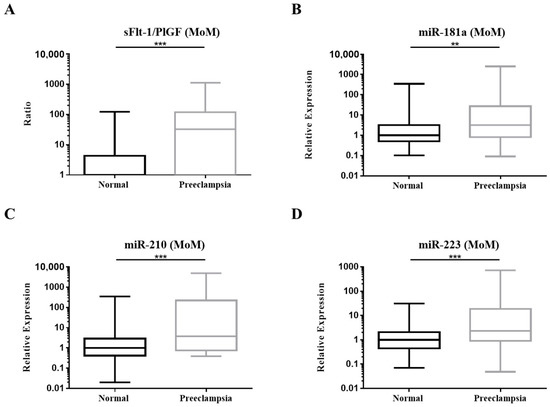 Box plots of the multiple of median (MoM) values of third-trimester (A) sFlt-1/PlGF ratio; (B) miR-181a; (C) miR-210 and (D) miR-223. Comparisons between the normal (n = 150) and the PE (n = 27) group were calculated by Mann–Whitney U test, ** p < 0.01, *** p < 0.001.
