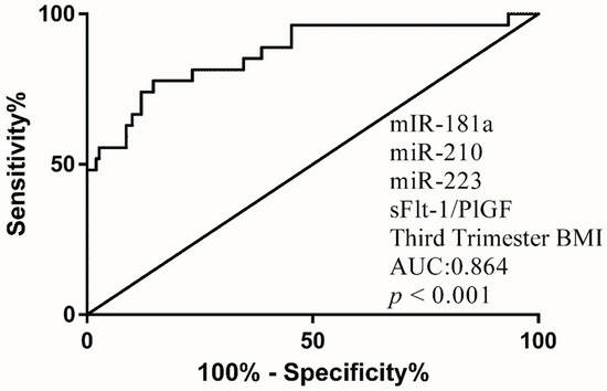 Higher MoM of the sFlt-1/PlGF ratio, miR-181a, miR-210 and miR-223 were observed in the PE group (Figure 4). Various combination of biomarkers was analyzed for the validity of PE prediction. Combination of sFlt-1/PlGF MoM, miR-181a MoM, miR-210 MoM, miR-223 MoM and BMI achieved the highest AUC (0.864) (Figure 5 and Table 4).