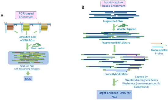 The amplicon-based method involves amplification of the genomic ROI using polymerase chain reactions (PCRs). Here, primers are designed targeting areas flanking desired genomic regions and are used to amplify these regions several thousand-fold, thus enriching them for sequencing. Generally, multiple primers are designed, and PCR conditions are standardized so they work simultaneously in a single multiplexed PCR reaction to amplify all the target genomic regions. To the PCR products or amplicons, sequencing adapters (sequencing platform-specific synthetic stretches of DNA) are attached by ligation to generate a ‘library’ of the enriched DNA population ready for sequencing. These adapters include sequences utilized for clonal amplification of DNA prior to sequencing, barcode sequences that act as identification tags for the samples, and sequencing primer binding regions [10]. A schematic representation of the processes is presented in Figure 1A.