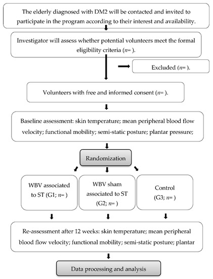 Based on the above considerations, this paper presents a detailed protocol for a single-blind, randomized, controlled clinical trial guided by the SPIRIT (Standard Protocol Items: Recommendations for Interventional Trials) guidelines [31], which aims to identify additional effects of WBV associated to ST. The results will follow CONSORT (Consolidated Standards of Reporting Trials) recommendations for nonpharmacological interventions [32]. The objectives of this study are, primarily, to assess the efficiency of WBV associated with ST on lower-limb blood flow and mobility of older adults with DM2 and, secondly, to verify responses to semi-static position, plantar position and stance.