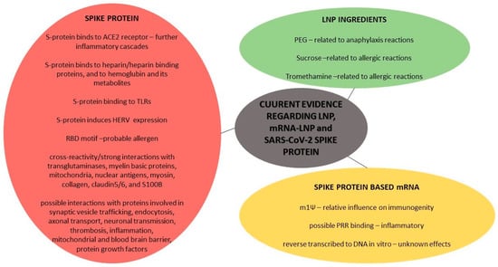 - Initially, the vaccine-derived mRNA is translated into proteins by ribosomes, used as an endogenous antigen and degraded by the proteasome into antigenic peptides, which are presented to CD8+ cytotoxic T cells via the MHC class I molecular pathway to activate cell-mediated immune responses; these products can be secreted into the extracellular space, thus entering the bloodstream, in which, they are uptaken by APCs, and antigenic peptides are delivered to CD4+ T lymphocytes through MHC class II molecules [188]. However, coronavirus infection was known for the massive production of viral proteins that can overload the folding capacities of the endoplasmic reticulum, and the possible misfolded antigens lead to final cell apoptosis, but this point is not studied regarding the vaccine-derived proteins [189]. A study showed that the circulating antigen was identified at detectable levels in the plasma of few mRNA vaccine recipients 1 day after vaccination. IgA levels were reported early, and IgG levels were reported 14 days post-vaccination; antigen levels declined and became undetectable by day 14 for most recipients, and no protein was detectable after the second vaccination, except for a case that was detected 1 day after but was undetected 2 days later [190]. On the contrary, a recent study revealed that mRNA vaccination stimulates robust germinal centers in lymph nodes containing vaccine mRNA and spike antigens up to 8 weeks post-vaccination in certain cases [191]. Some evidence indicates that the receptor-binding motif RBD, binding to human ACE2B (437–508), as well as to two fusion peptides, may be a possible allergen that may cause possible anaphylaxis, whereas the results from both tools point to the receptor-binding motif RBD of the spike protein as a probable allergen [192]. A study also assessing a mouse model injected with the S1 subunit spike protein concluded that the SARS-CoV-2 main pathology starts by ACE2 endothelial damage and that this pathology may be induced by the injected spike protein, and another study in mice revealed that the S1 protein crosses the Blood–Brain Barrier (BBB) [193,194]. The ACE2 receptors’ distribution in all tissues and women’s vulnerability due to chromosome X was evident from the very beginning of the COVID-19 pandemic; however, even if ACE2 mRNA is expressed homogeneously in all tissues, the same is not always the case for ACE2 protein expression [195]. A proteomic analysis revealed that SARS-CoV-2 proteins (including the spike protein) bind to hemoglobin and its metabolites, and that this—in extreme conditions—could even result in an integrated stress response and the global inhibition of mRNA translation, but, generally, in further medical conditions [196]. Furthermore, Human Endogenous Retroviruses (HERVs) or their viral products may enhance virus infection and penetration into human cells, or HERVs may create proteins that regulate the ribosome’s translation start, altering the pattern of COVID ORFs in various human hosts. In addition, a study showed that the spike protein induced in vitro human endogenous retroviruses’ HERV-W ENV expression, and, also, HERV-K was found to be elevated in COVID-19 patients [197]. The spike protein has also been linked with Alzheiner’s disease; like dementia and cognitive impairment, the Spike protein S1 RBD motif can bind to heparin and heparin-binding proteins, suggesting clues about neurodegeneration. In addition, the spike protein was found to have a significant binding to Toll-like Receptors (TLRs) in in silico studies—especially TLR4 [198,199,200]. Finally, two studies revealed a SARS-CoV-2 spike protein cross-reactivity and strong interactions with transglutaminases, myelin basic proteins, mitochondria, nuclear antigens, myosin, collagen, claudin5/6 and S100B, as well as possible interactions with many proteins, including proteins involved in synaptic vesicle trafficking, endocytosis, axonal transport, neuronal transmission, thrombosis, inflammation and the mitochondrial and blood–brain barrier, as well as protein growth factors [201,202].