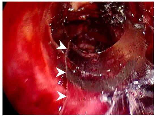 Intraoperative view of Case 1 demonstrating a linear fracture on the left ventral side of the cannula (arrowheads).