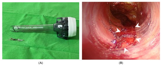 The patient underwent transoral endoscopic left thyroidectomy. After complete dissection of the thyroid gland, the central port was withdrawn to remove the surgical specimen, which was enclosed in an endo bag (Endo Pocket, UNIMAX, New Taipei, Taiwan). A broken cannula with a defect in the distal part was observed (Figure 2A). The cannula defect was on the ventral side, which was in contact with the mandible (Figure 2B). Missing fragments constituting the cannula defect were found in the operative field. Postoperatively, the patient recovered smoothly. Pathological examination revealed non-invasive follicular thyroid neoplasm with papillary-like nuclear features.