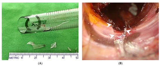 The broken cannula in Case 3. (A) The fractured part is at the distal end of cannula. Four fragments were retrieved. (B) Intraoperative view shows a cannula fracture with a defect on the ventral side of the cannula (arrowheads).