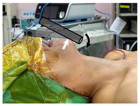 Proposed mechanism for cannula fracture. During the surgery, the observation port (black cylinder) is tilted down (black arrow) to inspect the operative field. This action applies a force against the mandible, which results in an equal counterforce (white arrow) to the cannula that leads to cannula breakage.
