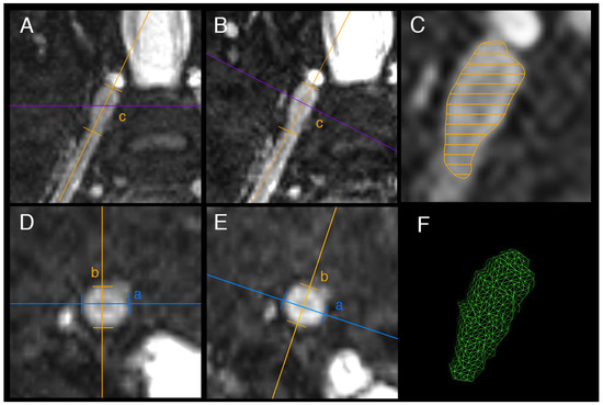 Exemplary images of dorsal root ganglion (DRG) volumetry. For non-axis corrected volume estimation the DRG main axes a, b, and c were measured in standard anatomical reformations ((A): coronal, (D): axial). For axis-corrected volume estimation, main axes were measured in coronal (B) and axial (E) reformations, that were aligned with the orientation of the individual DRG. Both methods of volume estimation rely on the same formula of an ellipsoid V = π/6 × a × b × c. For exact volumetry, the volume of the DRG was segmented in multiple axial planes ((C) showing coronal view with axial planes symbolized as parallel lines). Subsequently, a 3D model was created (F) and volume was calculated.