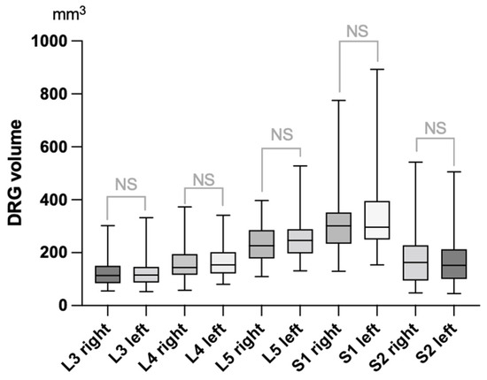 Box-and-whisker plot of dorsal root ganglia (DRG) volumes as assessed by exact volumetry after 3D-segmentation in 60 healthy individuals. Median values are indicated by the horizontal line. Box length shows interquartile range, whereas whiskers represent range of data. NS = non-significant.