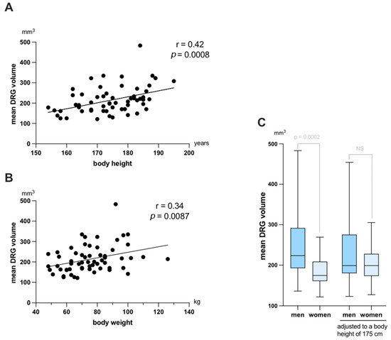 Correlation analyses revealed positive correlations of mean DRG volume (mean of L3 to S1, averaged over both sides) with both body height (r = 0.42; p = 0.0008) and body weight (r = 0.34; p = 0.0087) (Figure 4A,B). Associations of mean DRG volume with age (r = 0.21, p = 0.09) and body mass index (r = 0.18, p = 0.17) were not statistically significant. Mean DRG of men was significantly higher than that of women (244.4 vs. 183.4 mm3; p = 0.0002; Figure 4C). This could be attributed to men in our cohort being taller overall. No difference could be detected between men and women when corrected DRG values were compared, which were adjusted to a body height of 175 cm by linear regression (Figure 4C).