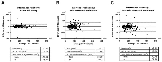 Bland-Altman plots of inter-reader reliability. Dorsal root ganglia (DRG) L3 to S2 were analyzed in 25 participants by two readers by exact volumetry (A), axis-corrected estimation (B), and non-axis-corrected estimation (C). SD = standard deviation.