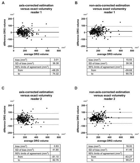 Bland–Altman plots of inter-method reliability are given in Figure 6. Systematic error (bias) of axis corrected estimation when compared with exact volumetry is practically neglectable in both readers (≤3 mm3; Figure 5A,C). Non-axis-corrected estimation, however, was associated with a systematic error (bias) of 15.55 mm3 in reader 1 and 18.00 mm3 in reader 2 when compared with the gold standard of exact volumetry. This means DRG volume is systematically overestimated by non-axis-corrected estimation. The random error (standard deviation of bias) of axis-corrected and non-axis-corrected estimation were comparable and ranged between 36.38 mm3 and 41.80 mm3. Subsequently, 95% limits of agreement ranged between −68.29 and 82.76 mm3 for axis-corrected estimation vs. exact volumetry and −63.27 and 99.27 mm3 for non-axis-corrected estimation vs. exact volumetry.