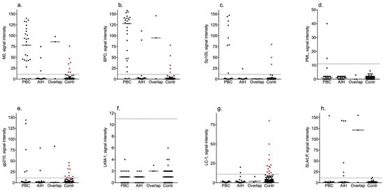 Signal intensity values of specificities in the blood donor and disease cohorts. Red dots indicate controls with signal intensity values above the manufacturer’s cut-off. PBC, primary biliary cholangitis; AIH, autoimmune hepatitis; Overlap, AIH-PBC overlap syndrome; Contr, control; (a) M2—E2 subunit of pyruvate dehydrogenase; (b) BPO—recombinant fusion protein of the E2-subunits of the three main M2-antigens branched-chain 2-oxoacid dehydrogenase complex [BCOADC], pyruvate dehydrogenase complex [PDC] and 2-oxoglutarate dehydrogenase complex [OGDC]; (c) Sp100—speckled protein 100; (d) PML—promyelocytic leukaemia protein; (e) gp210—glycoprotein 210; (f) LKM-1—liver kidney microsomal 1 antigen; (g) LC-1—liver cytosol 1 antigen; (h) SLA—soluble liver antigen.