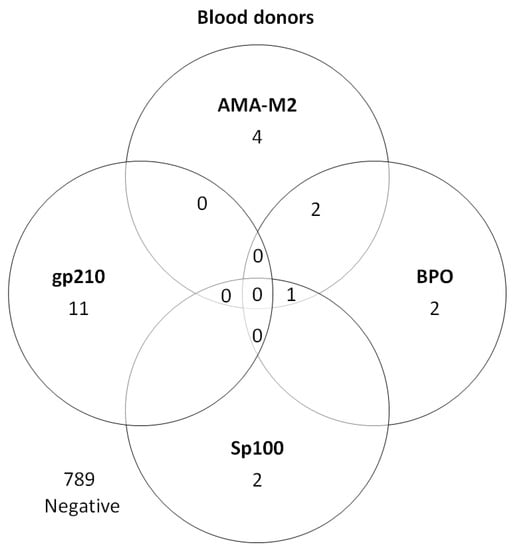 In total, the most frequent finding was anti-LC-1 that was found in 13 (1.6%) of the 825 blood donors. Another 11 individuals (1.3%) tested positive for anti-gp210, 9 (1.1%) for AMA-M2 and/or anti-BPO, and 3 for anti-Sp100 (0.3%)—see Figure 2 and Table 2.