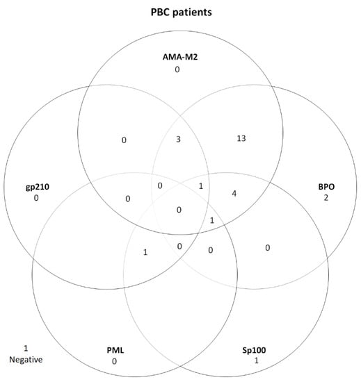 Moreover, 26 (96.3%) out of the 27 PBC-patients were EUROLINE immunoblot-positive; AMA-M2 (n = 22, 81.5%), anti-BPO (n = 24, 88.9%), anti-Sp100 (n = 8, 29.6%), anti-gp210 (n = 5, 18.5%), and anti-PML (n = 2, 7.4%)—see Figure 3 and Table 2. AMA-M2 and anti-BPO were concomitantly positive in 24 (88.9%) of the PBC cases. One of the AMA positive patients was also anti-SLA positive.