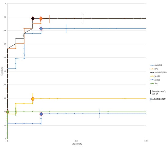 ROC curve for each specificity with EUROLINE’s recommended cut-off (>10) with truncated X-axis. AMA-M2—E2 subunit of pyruvate dehydrogenase; BPO—recombinant fusion protein of the E2-subunits of the three main M2-antigens branched-chain 2-oxoacid dehydrogenase complex [BCOADC], pyruvate dehydrogenase complex [PDC] and 2-oxoglutarate dehydrogenase complex [OGDC]); AMA-M2/BPO—AMA-M2 and/or BPO; Sp100—speckled protein 100; gp210—glycoprotein 210; SLA—soluble liver antigen.