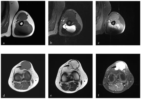 - Nishimoto, K.; Kusuzaki, K.; Matsumine, A.; Seto, M.; Fukutome, K.; Maeda, M.; Hosoi, S.; Uchida, A. Surrounding muscle edema detected by MRI is valuable for diagnosis of intramuscular myxoma. Oncol. Rep. 2004, 11, 143–148. [Google Scholar] [CrossRef]