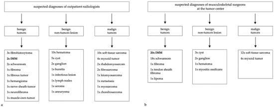 Suspected diagnoses by radiologists and musculoskeletal surgeons (multiple diagnosis per patient possible): (a) reported suspected diagnoses by the outpatient radiologists; (b) reported suspected diagnoses by the musculoskeletal surgeons at the specialized tumor center.