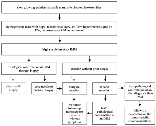 In summary of the results of our study and the existing literature, we recommend the diagnostic and therapeutic pathway shown in Figure 3. In cases with a slowly growing painless mass located in the extremities, MRI should be performed as the next diagnostic step according to the current literature and guidelines for sarcomas. An MRI provides the ability to assess prior to biopsy whether the tumor is more likely to be benign or malignant, thus enabling a critical planning of the biopsy. If the findings on MRI are classic for IMMs (Table 1), an IMM can be suspected at a high grade. In these cases, a decision between a direct resection and a prior biopsy must be made. If a biopsy is possible in consideration of the tumor location, tumor size, and tumor consistency, then it should be performed. In this occasion, we recommend an incisional biopsy in order to be able to secure a sufficient amount of tumor for histopathological analysis. A fine needle aspiration biopsy should not be performed, as both our study and the existing literature show that this form of biopsy is vulnerable to error due to the small amount of tumor material. If the biopsy confirms an IMM, a marginal resection can be performed subsequently. However, if a biopsy is not possible, we recommend a complete tumor resection with a safety margin. This avoids the necessity of a subsequent resection in the unlikely event of a malignant tumor, and potential contaminations can be avoided.