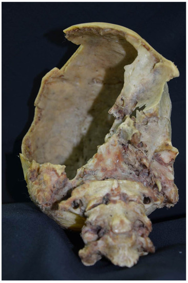 The body segments were analyzed through an anthropological survey and then a MSCT total-body 3D with a 64-slice MSCT system (Aquilion CX 64, Toshiba Medical System, Tokyo, Japan) was carried out in order to obtain a 3D reconstruction of the bone fragments to carry out an accurate macroscopic analysis. At the conclusion of the PMCT, an autopsy was performed and tissue samples were taken in order to perform a histopathological investigation of the organs. The tissue samples were preserved in formaldehyde that was diluted to 10%. For all the samples, the methods and systems of classical histology by paraffin embedding and hematoxylin-eosin staining were used; descaling treatment was also adopted for the fragments of the parietal bone tissue by immersion in long latency in a mixture of hydrochloric acid, nitric acid, and sulfuric acid in order to obtain adequate descaling, which allowed the passage of bone tissue to the rotary microtome. Successively, the head was placed in a cold room at 2 °C for further anthropological examination and skeletal reduction. Following this, the soft tissues of the head were skinned with the use of a scalpel. The soft tissue dissected was analyzed on the periosteal side. The skeletal reduction was achieved by maceration techniques [11] for two days at a temperature of 55–60 °C. The human remains were subsequently so treated: