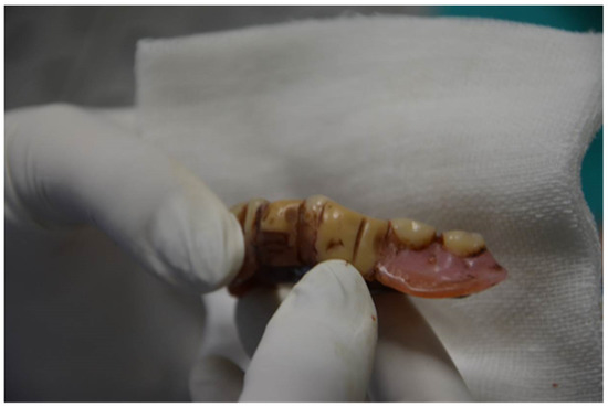 It was found that two dental prosthetic elements of the mandibular arch were scratched on the front surface with non-serrated margins (such as a negative impression of the sharp blade of the medium used). Instead, the maxillary arch prosthetic presented no scratching. The bone elements of the hard palate were fractured. The skull presented fractures in the frontal, temporal, parietal, and occipital right side. The margins of all fractures of the head showed macroscopic characteristics of vitality. On the bones, it was noted that there was a rupture of the right styloid process and a fracture into three points of the mandible on the right branch. The third cervical vertebra appeared tangentially scratched on the lower surface. It also noted that there was a fracture of the hyoid bone on the right side, 5 shards with edges and linear vitality belonging to a crown, and 14 fragments belonging to the splanchnocranium.