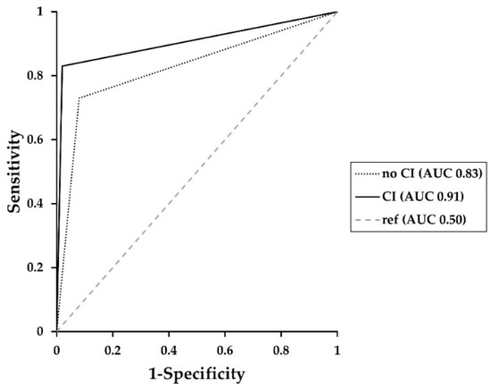 Receiver operating characteristic curves (ROC) showing the diagnostic performance of primary tumor detection over all radiologists whether clinical information (CI) was provided. Area under the curve (AUC) without CI = 0.83; with CI = 0.91. See Appendix A for ROC and AUC values for each reader.