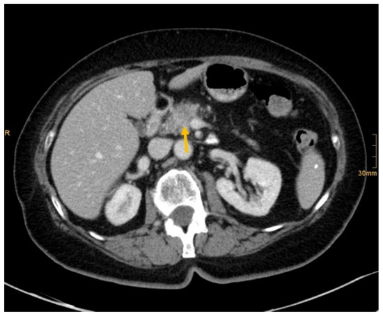 Pancreatic cancer (arrow). All readers identified the lesion in absence and presence of clinical information (Recurrent epigastric pressure and 9 kg weight loss in 4 months.).