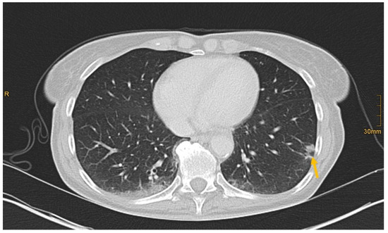 There are several reasons why tumors and metastases could be missed by radiologists. Firstly, the interpretation of oncological CT data sets is challenging; often multiple abnormalities are present in a single patient. Lesions may be benign and not always malignant. Therefore, findings could be undercalled and misinterpreted as benign (e.g., Figure 2) [1]. Findings may also be too small to be classified as malignant or may be overlooked (e.g., Figure 4). Additionally, findings, particularly of the lung, could be consistent with a postinflammatory benign aetiology due to configuration and subpleural location (e.g., Figure 5) [46]. Secondly, the so-called satisfaction of search represents another possible influence on the detection rate of malignant lesions. Satisfaction of search represents an interference of a radiological finding with the detection of further abnormalities [1,47]. Radiological image interpretation often follows a fixed procedure. Thus, as soon as a finding (mostly the primary tumor) is made, further lesions as metastases may be missed. This may explain the lower rate of true positive metastatic findings. Further reasons for missed metastatic lesions can be assumed. Metastases are often small, not reliably distinguishable from benign lesions and therefore an unequivocal diagnosis is often impossible without follow-up imaging or complementary procedures such as MRI, hybrid imaging, or biopsy. Moreover, imaging criteria for lymphogenous metastases are often controversial, an accurate identification is challenging. In the past, a short axis diameter of 1 cm was used as the cut-off value for enlarged, malignancy-susceptible lymph nodes [1]. Recent studies suggest different parameters for various anatomic regions, such as 6 mm for retrocrural or 8–10 mm for pelvic lymph nodes. However, enlarged lymph nodes are not always malignant. They also could have an inflammatory aetiology or normal-sized lymph nodes may have tumor involvement [48]. Of course, there are numerous cases in the present study that had been solved correctly. Figure 3 shows an example of a pancreatic carcinoma correctly diagnosed by all three radiologists irrespective of clinical information.