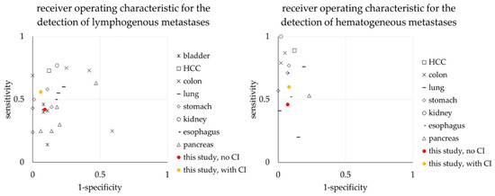 Comparison of sensitivities and specificities for metastasis detection per entity vs. reported data in the literature [18,19,20,21,22,23,24,25,26,27,28,29,30,31,32,33,34,35,36,37,38,39,40]. Lymph node metastasis on the left, hematogenous metastasis on the right.