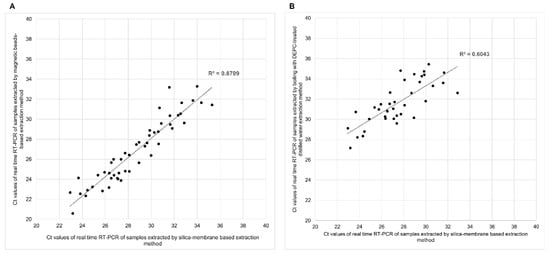 Correlation analysis between cycle threshold (Ct) values obtained by real-time RT-PCR using extracted RNA (n = 50) from silica-membrane-based and magnetic-beads-based extraction methods (A) and boiling using DEPC-treated distilled water extraction methods (B).