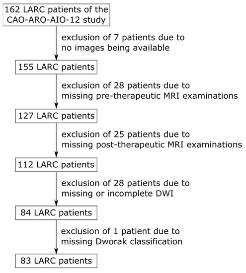 The inclusion criteria of this study were: (a) histopathologically proven LARC, (b) treatment with nCRT followed by TME and pathological assessment of the TRG, (c) availability of pre- and post-nCRT MRI examinations including axial, high-resolution T2w- and DWI-sequences with the calculation of ADC maps. Patients had to be excluded if their MRI dataset was either incomplete or the pathologic TRG was not available.